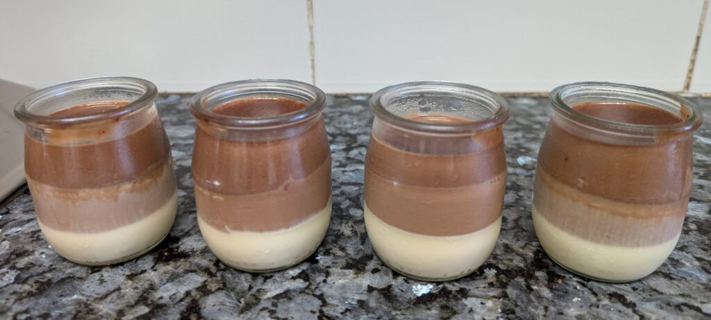 Empieza a preparar la siguiente capa (la de chocolate marrón). Cuando ya la tengas preparada, retírala del fuego y saca el molde o los vasitos de la nevera; espera unos pocos segundos para que la nueva capa no esté demasiado caliente. A continuación, añade despacio la nueva capa al molde o los vasitos.